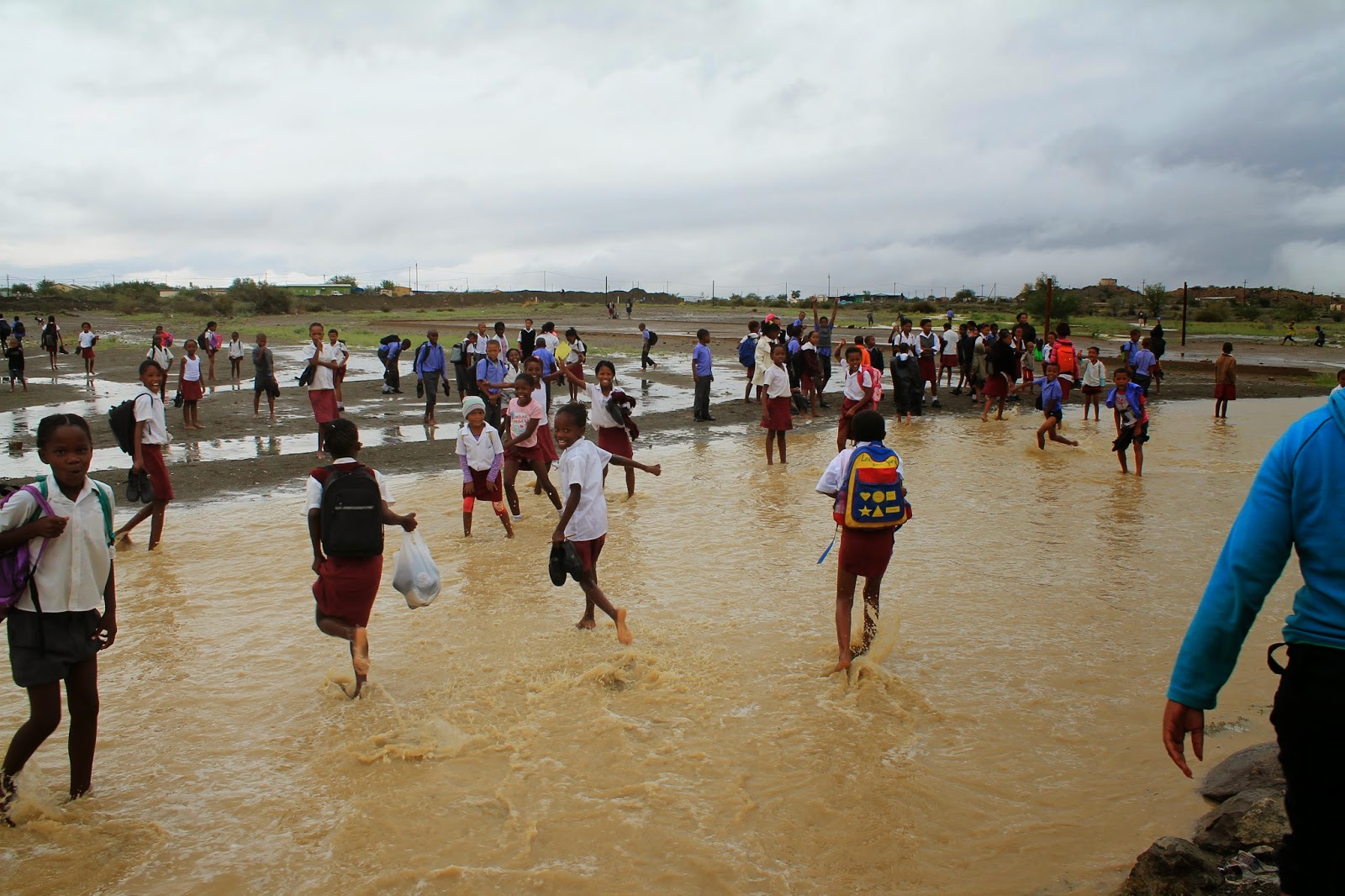 The chaos continued after school had finished. The strip of land directly outside the school gate was completely flooded, meaning that the learners basically had to wade across a small river to get to their homes!